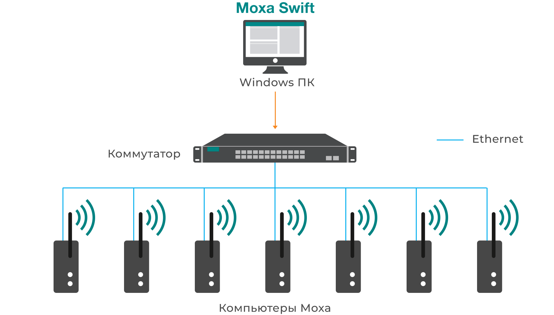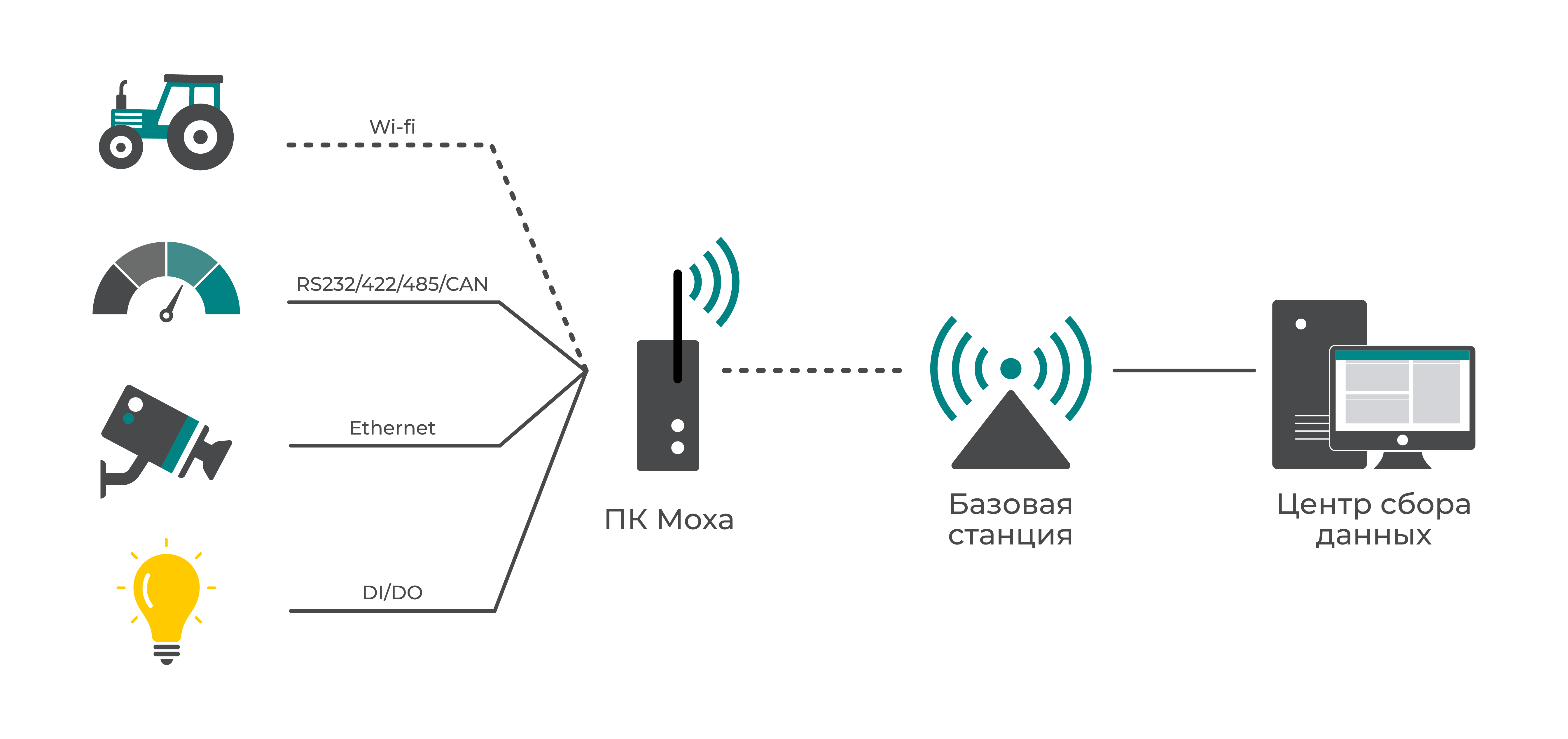 Промышленный компьютер, в отличие от другой промышленной техники, намного гибче и универсальнее. Он представляет собой программно-аппаратную платформу, которую можно перепрограммировать и адаптировать под бесконечное множество различных задач без изменения физической конструкции. На картинке ниже продемонстрировано возможное использование компьютера с использованием его вариаций физических интерфейсов.
