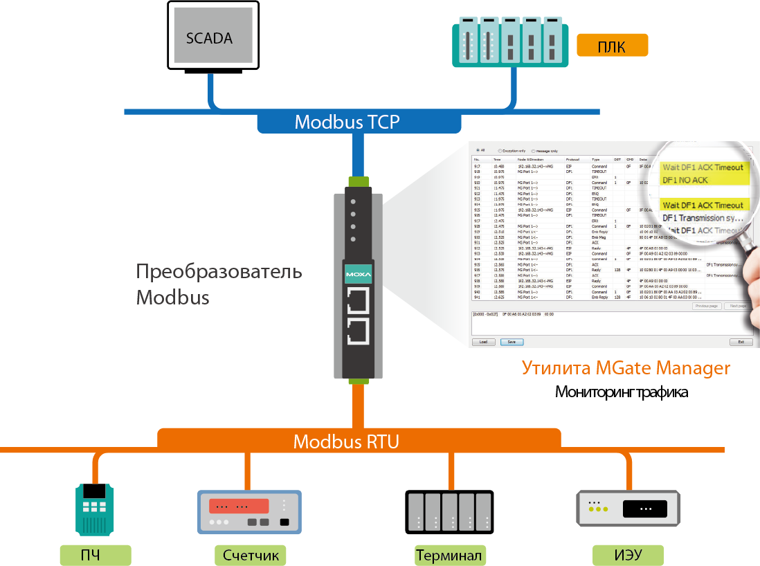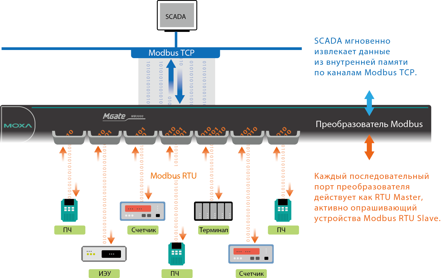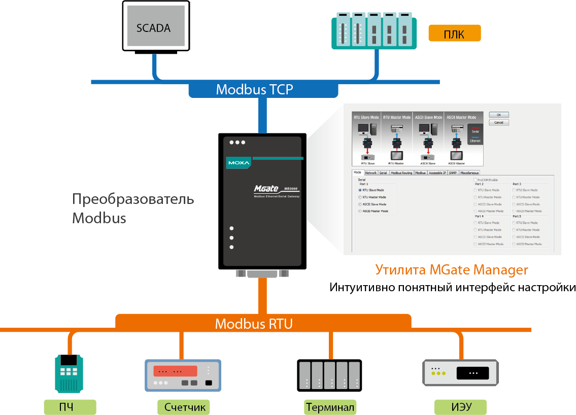 В промышленных приложениях наиболее распространено преобразование протокола Modbus RTU в Modbus TCP: обычно требуется интегрировать устаревшие устройства, такие как счетчики, в основном работающие по протоколу Modbus RTU, в SCADA-систему, использующую протокол Modbus TCP. Для инженеров важно найти решение, которое упростило бы задачу преобразования. Серия Modbus-преобразователей MGate MB3000 обеспечивает удобную конвертацию Modbus RTU в Modbus TCP, поддержка механизма активного опроса ускоряет производительность SCADA-систем, а утилита MGate Manager позволяет быстро настраивать преобразователи и устранять неполадки связи.