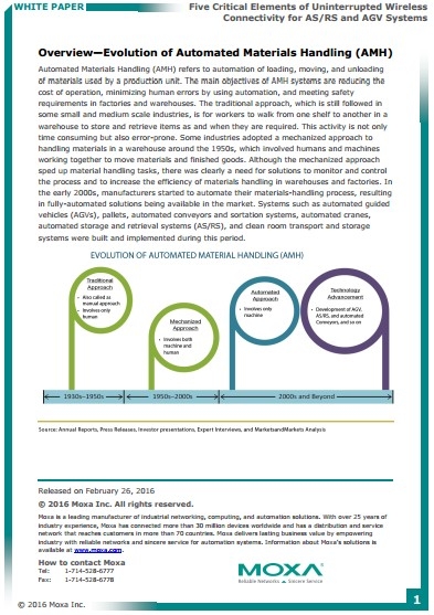 Компания Moxa предлагает своё беспроводное решение для автоматизации складских систем именно сейчас, когда происходит быстрое развитие данного сегмента рынка. Согласно отчету MarketsandMarkets.com о рынке автоматизированных складских систем, количество систем с радиоуправляемыми транспортными средствами (AGV) в 2015-2020 году в среднем вырастет на 15%. Исследования рынка показали, что такие системы позволяют снизить эксплуатационные затраты на 30%, а производители автоматизированных складских систем смогут завоевать преимущество в данном сегменте рынка.