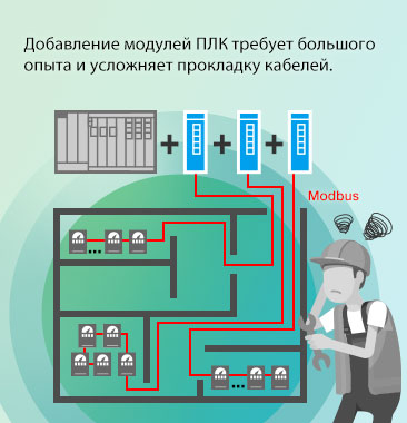 Централизованные модули ПЛК повышают требования к проводкеУстройства в централизованной системе управления подключаются непосредственно к ПЛК, к этому же ПЛК подключаются модули работы с Modbus. Следовательно, требуются большие затраты на прокладку электропроводки, а также на добавление дополнительных модулей ПЛК. Кроме того, увеличение затрат связано с необходимостью нанимать опытных программистов с опытом работы с различными протоколами, во избежание возникновения конфликтов между протоколами, и опытом настройки и обслуживания устройств. |