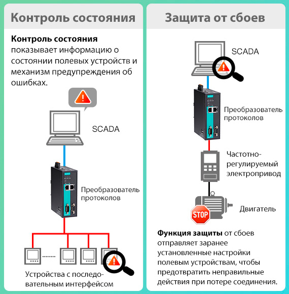 Преобразователи протоколов Moxa обладают встроенными средствами устранения неполадок, такими как диагностика протоколов и мониторинг трафика, и предлагают легкий способ поиска основной причины сбоя. Функция контроля состояния предоставляет информацию о состоянии полевых устройств, которая включает в себя список устройств, счетчик, результат завершенных команд и предупреждает SCADA-систему, когда устройство slave не отвечает. Функция защиты от сбоев (fault protection) задает предустановленные настройки всем полевым устройствам для перевода устройств в безопасное состояние в случае потери связи.