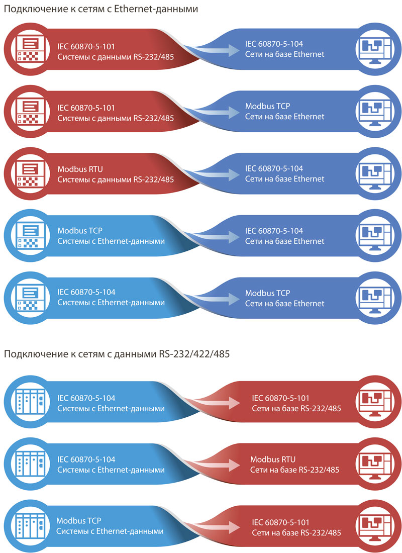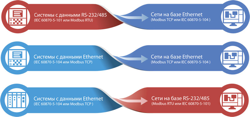 - Преобразование протоколов Modbus RTU/TCP, IEC 60870-5-101, IEC 60870-5-104