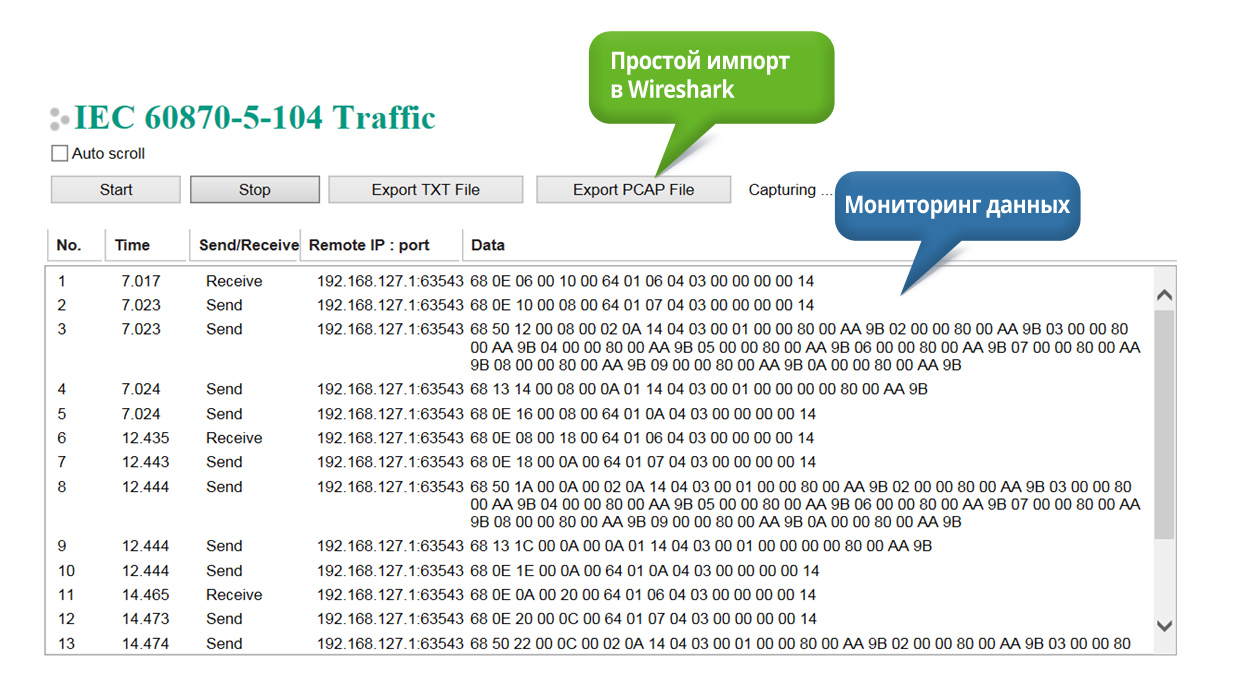- Встроенный инструмент мониторинга трафика Modbus RTU/TCP и IEC 101/104