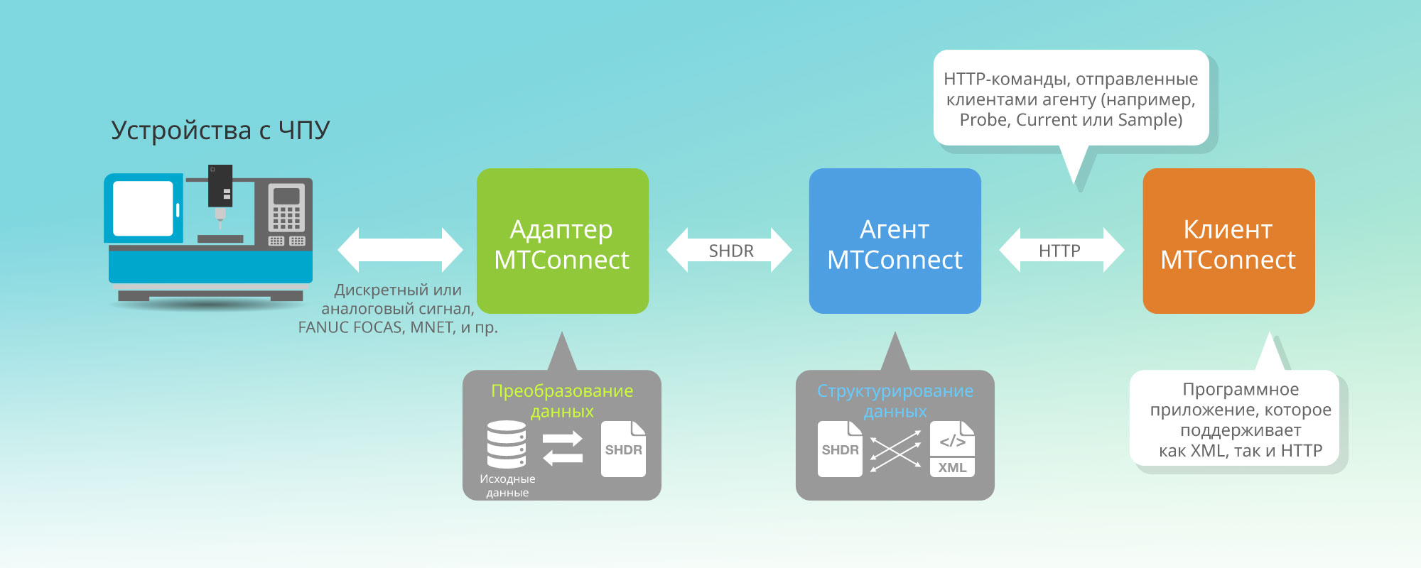 К ключевым элементам, из которых состоит приложение MTConnect, относятся адаптер MTConnect, агент MTConnect и клиент MTConnect. Адаптер MTConnect (может быть как аппаратным, так и программным) преобразовывает все данные, поступающие с устройства, в формат, который распознает агент MTConnect (обычно SHDR). Затем агент MTConnect сопоставляет эти данные с языком XML и позволяет клиенту MTConnect запрашивать данные по протоколу HTTP.