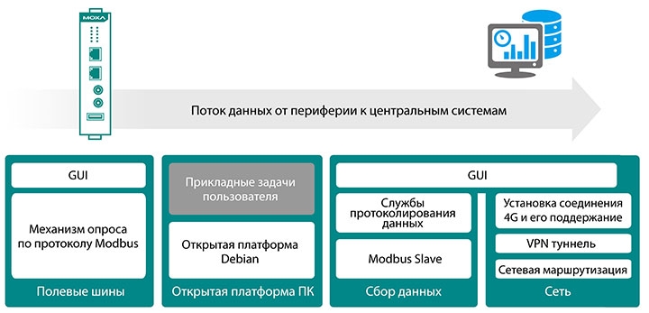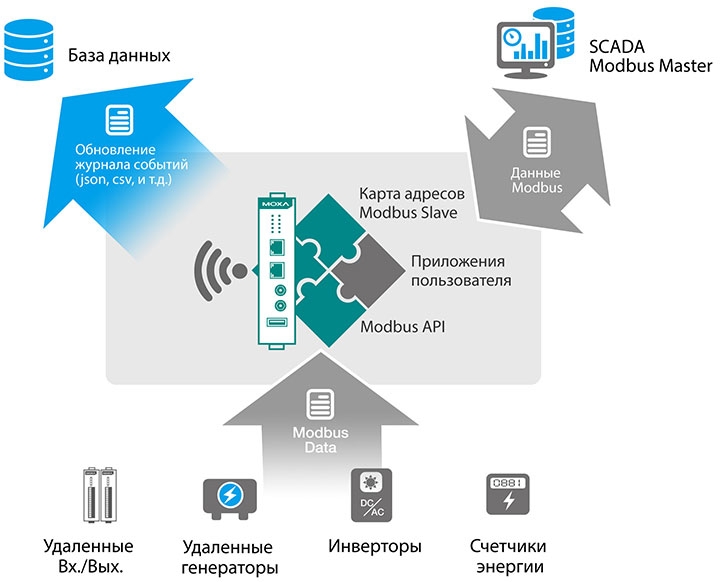 - Modbus API для взаимодействия с пользовательскими приложениями при необходимости организации вычислений, что обеспечивает большую гибкость программирования;