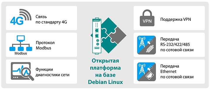 - Маршрутизация Ethernet/последовательных сетей в сеть сотовой связи для доступа всех периферийных устройств к сети 4G.